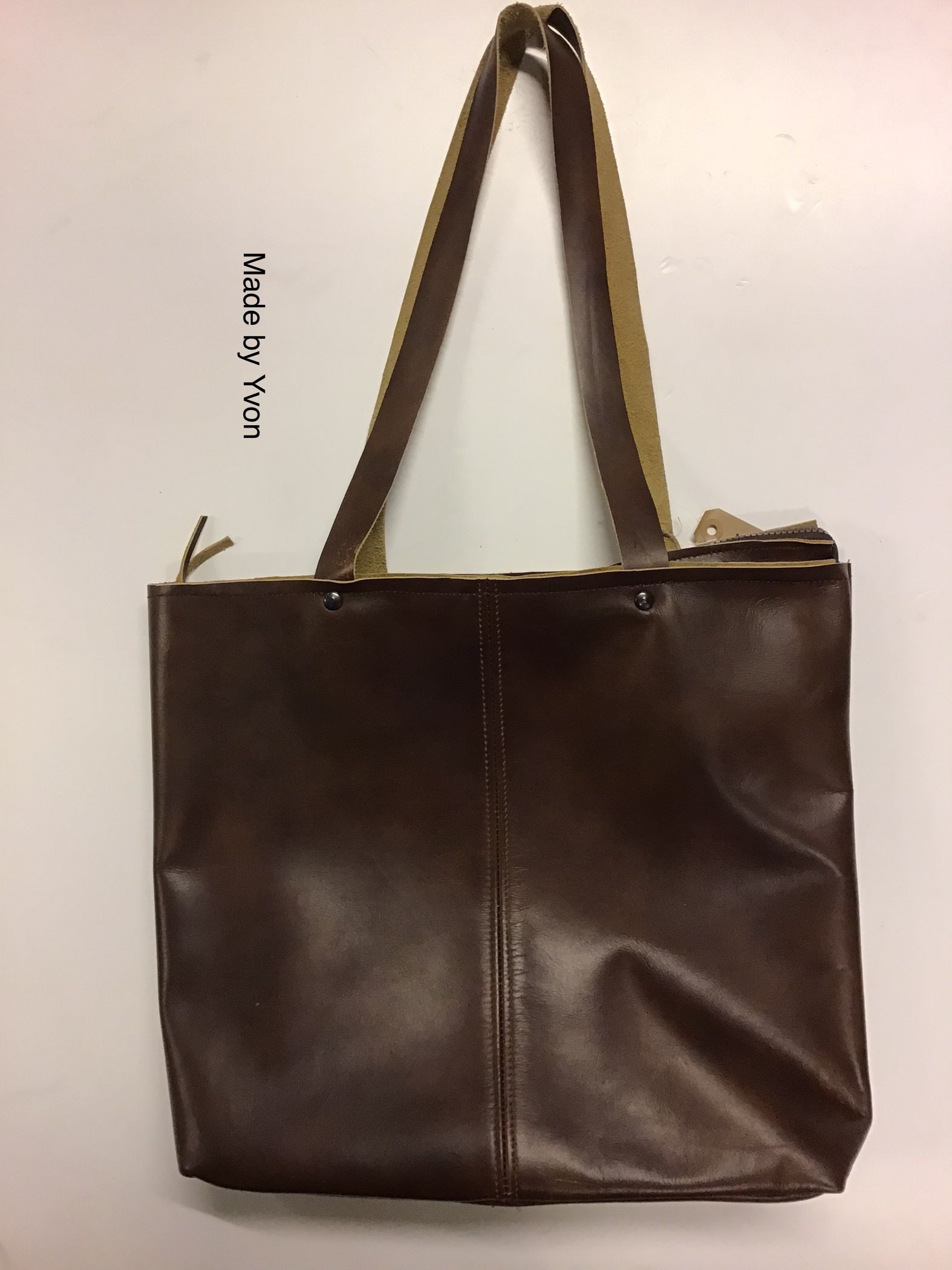 Tas, echt leer, geel, 46 x 44 cm.